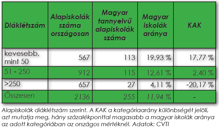 Míg az országban az alapiskolák mindössze negyede 50 fő alatti létszámú, addig a magyar iskolák esetében ez az arány több mint 40 százalék. Épp fordított a helyzet a 250-nél több diákot számláló, nagy iskolákkal, amelyek aránya a magyar intézmények körében csak