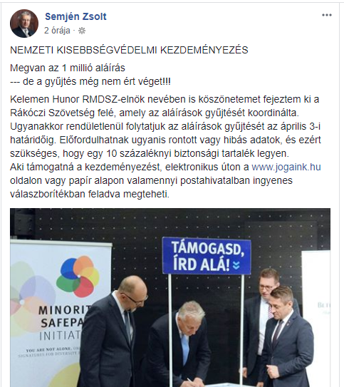 Semjén Zsolt magyar nemzetpolitikáért felelős miniszterelnök-helyettes ma a facebook-on jelentette be, hogy összegyűlt az egymillió aláírás a Minority SafePack nevű nemzeti kisebbségvédelmi kezdeményezésre.