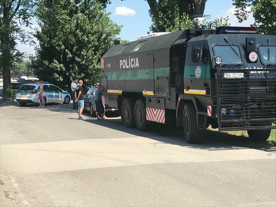 Az előbb érkezett ez a rendőrségi jármű a gazdák pozsonyi „bázisára”. A rendőrök szerint a vízágyúk nincsenek töltve, azonban kérdéseket vet fel, hogy mire készülhetnek. Ilyen és ehhez hasonló rohamkocsikkal a DAC-Slovan meccsek előtt szoktunk találkozni.