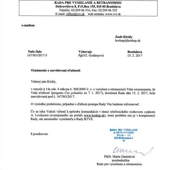 Amint arról korábban már beszámoltunk, Az elmúlt napokban a Körkép.sk hivatalos beadvánnyal fordult Václav Mika, az RTVS (szlovák közmédia) vezérigazgatójához, valamint a Tévé- illetve Sugárzási Tanács vezetőjéhez és azok magyar nemzetiségű tagjaihoz.