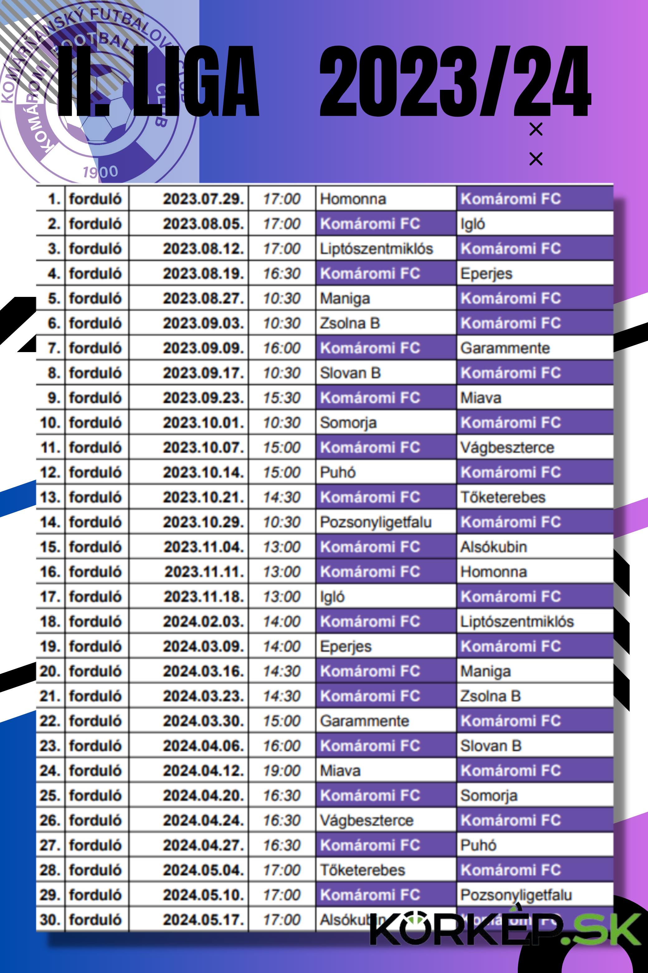 A Szlovák Labdarúgó-szövetség döntése értelmében véglegessé vált a szlovák országos másodosztály programja. Eszerint a Komáromi FC idegenben kezdi és zárja az idényt.