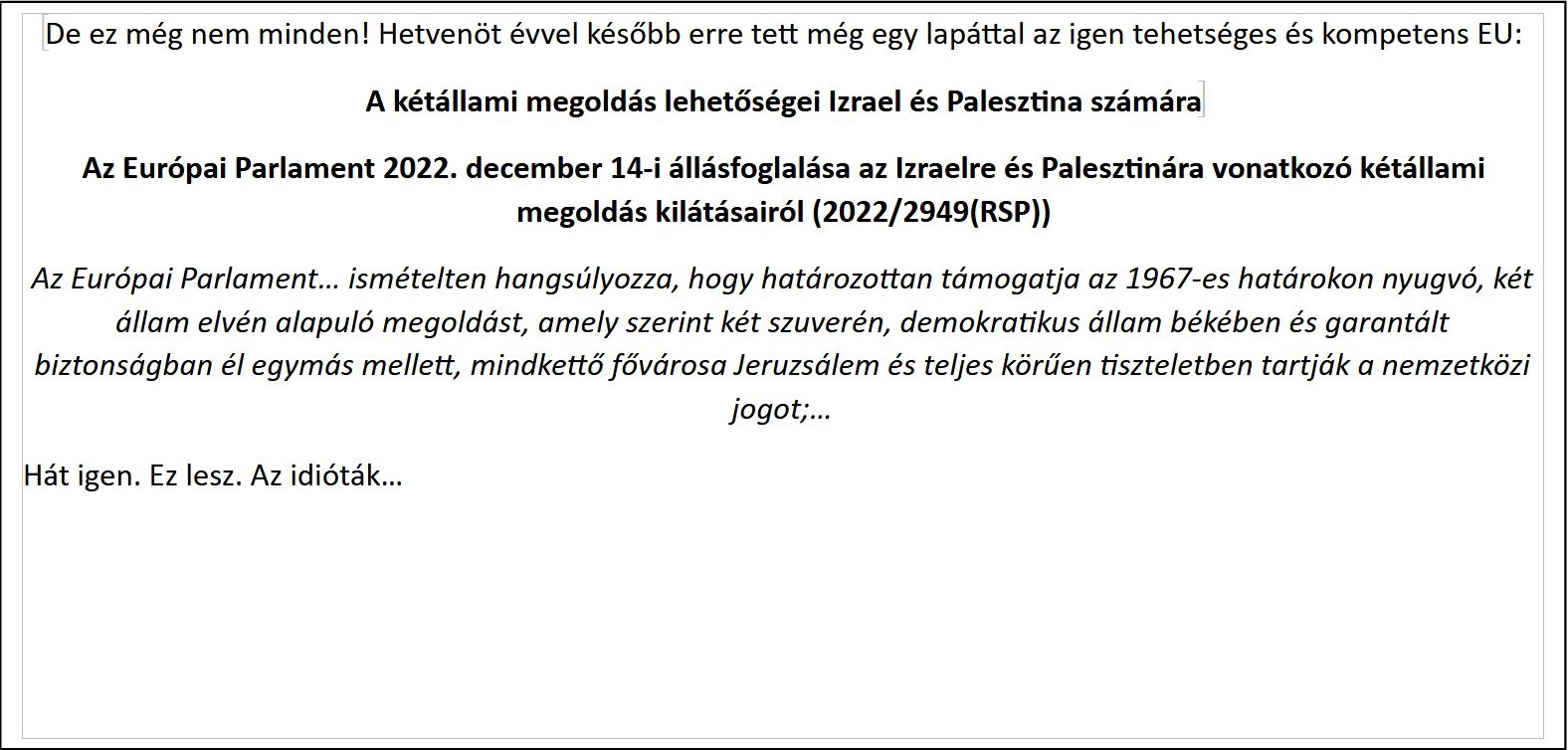 Ezt úgy találták ki, hogy az idevágó gyakorlatra hagyatkoztak, miszerint egy-egy város több államnak is fővárosa, ugyanabban az időben! Például, hogy Berlin Franciaországé is, meg Párizs Németországé – ja, nem… Nem, bocsánat! Ilyenre egyetlen példa sincs! De az angolok ott az ENSZ-ben ezt igen jól kitalálták. Hihetjük-e, hogy elsősorban is Clement Attlee, Harry S. Truman, Vincent Auriol, Joszif Sztálin és Csang Kaj-sek uraknak, akik mindahányan ott bólogattak akkor, tudomása sem volt arról, hogy a zsidók és a palesztinok nincsenek igazán jóban? Ugye nem?
