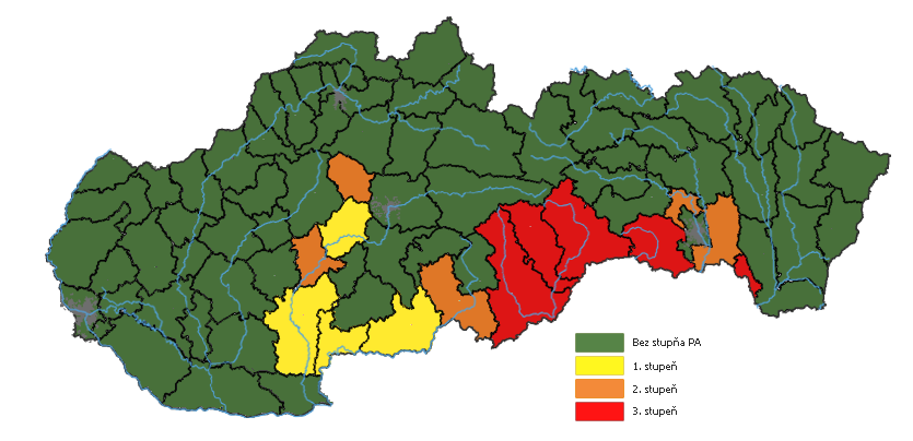Az Országos Hidrometeorológiai Intézet négy járásra a legmagasabb, harmadfokú árvízvédelmi riasztást rendelt el ma este 8 óráig a várható bő csapadék és a folyók szintjének jelentős megemelkedése miatt. Az érintett járások a Rimaszombati, a Nagyrőcei, a Rozsnyói és Kassa környéke bizonyos területei. A legveszélyeztetettebb területek az Olsava, Bódva és Ronyva folyók árterei.