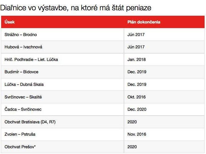 Karolína Ducká minisztériumi szóvivő szerint a további szakaszok építése attól függ, hogy sikerül-e további forrásokat találniuk a közúthálózat fejlesztésére. Az alábbi táblázat az építés alatt lévő autópálya-szakaszokat jelzi: