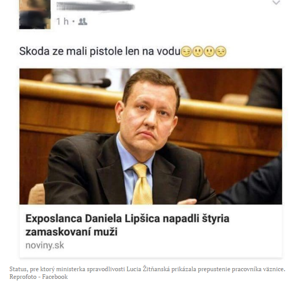 A Büntetésvégrehajtási és Igazságügyi Őrszolgálat Testületének (Zbor väzenskej a justičnej stráže) dolgozója azt írta a közösségi hálón közzétett bejegyzésében: „kár, hogy csak vízipisztolyuk volt” és mellékelte azt a cikket, amely arról adott hírt, hogy a héten négy álarcos férfi támadta meg egy pozsonyi óvoda előtt a volt politikust, Daniel Lipšicet, akit vízipisztollyal spricceltek le – írta a TASR hírügynökség a Denník N portálján megjelent cikkre hivatkozva.