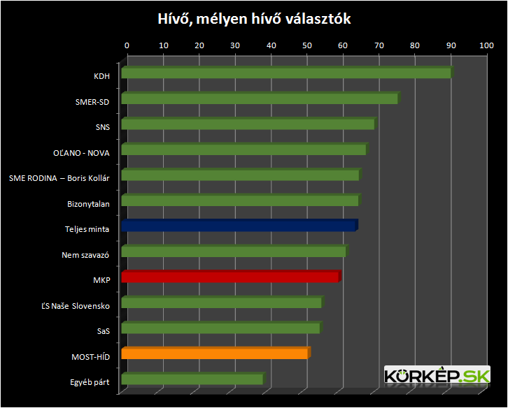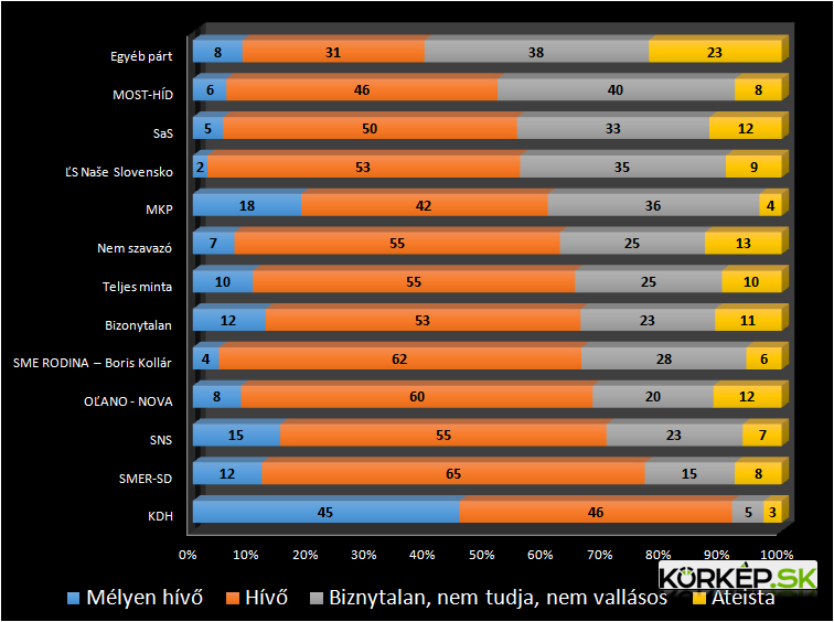 Talán nem meglepő, hogy a szlovákiai pártok közül a KDH választói a legvallásosabbak, több mint 92 százalékuk tartja magát mélyen hívőnek, vagy hívőnek (az egyszerűség kedvéért vegyük egy kalap alá a hívőket és a vallásos embereket).
