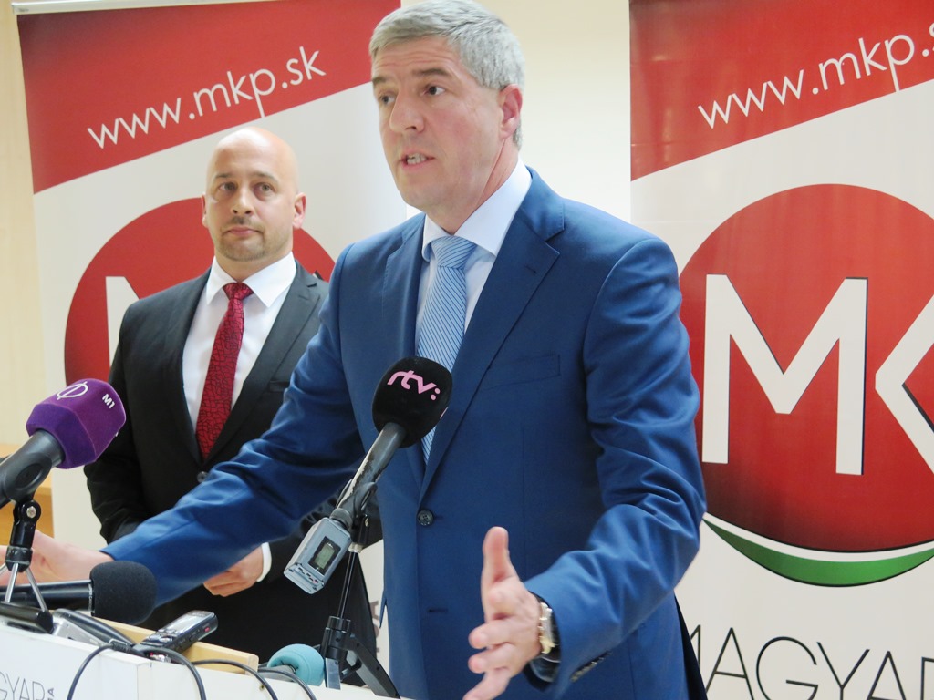 Menyhárt József, a felvidéki Magyar Közösség Pártja (MKP) elnöke (b) és Bugár Béla, a Most-Híd szlovák-magyar vegyespárt elnöke sajtótájékoztatót tart az õszi megyei választásokon való együttmûködés lehetõségeirõl tartott megbeszélés után az MKP pozsonyi székházában 2017. április 26-án.