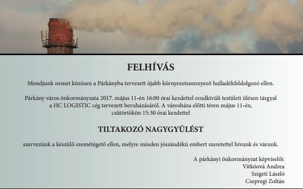 A párkányi önkormányzat három képviselője tiltakozó nagygyűlést szervez május 11-én 15:30 órai kezdettel a párkányi városháza elé. A tüntetésre várják a párkányi és esztergomi térségben élő ellenzőket.