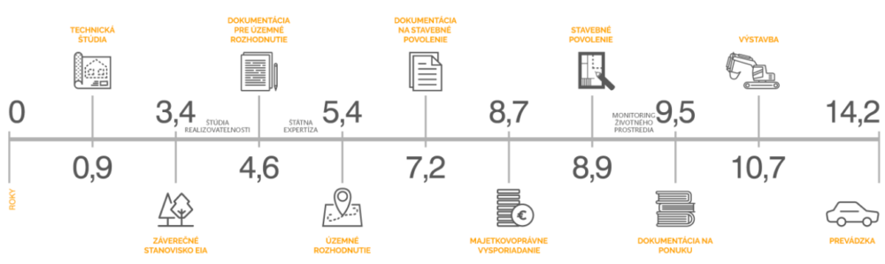 Szlovákiában egyébként legendásan lassan épülnek az autópályák. A tervezés első szakasza átlagosan 4 és fél évet vesz igénybe, újabb négy évre van szükség a nyomvonal meghatározásához (ennek érzékenységét és politikai fontosságát a korábbi botrányoknak köszönhetően már jól ismerjük) és a telkek felvásárlásához. További két évbe telik, mire ténylegesen elkezdődnek a munkálatok, amely átlagosan 4 és fél évig tartanak.
