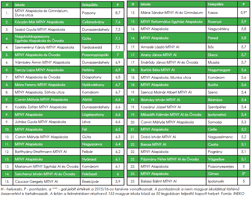 Az alábbiakban összegyűjtöttük a Tesztelés 9-ben részt vevő 133 magyar tannyelvű alapiskola INEKO-eredményeit. A jó és annál jobban szereplő iskolákat rangsoroltuk is az intézet hiánytalanul elérhető 2014/15-ös tanévre vonatkozó adatai alapján.
