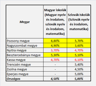 Az öt magyarlakta megyéből csak kettőben (Nyitra és Kassa megye) szerepeltek gyengébben a magyar alapiskolák diákjai, mint szlovákiskolás társaik. Pozsony megyében a magyar diákok 6,8 százaléka teljesített legalább 90 százalékosan, míg a szlovákiskolások „csak” 5,7 százaléka.
