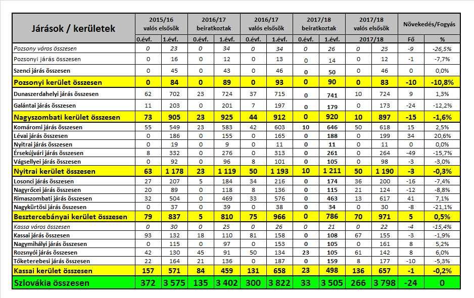 A legtöbb magyar alapiskolás elsős a Dunaszerdahelyi (724) és a Komáromi (618) járásban illetve a Rimaszombati járásban van, a legkevesebb a Nyitrai járásban (11), valamint a két nagyvárosban, Pozsonyban (12) és Kassán (22).
