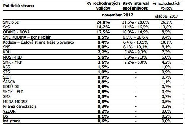 A jelenlegi leggyengébb tömörülés a parlamentben a felmérés szerint a Most-Híd, mely 5,6 százalékot és kilenc mandátumot szerezne. Bugárék eredménye 0,4 százalékkal gyengébb, mint októberben. A Most-Híd szlovák szavazóira ráadásul két formálódó, a felmérésekben egyelőre nem szereplő tömörülés (A Beblavý képviselte SPOLU és a Štefunko vezette Progresívne Slovensko) is nagy veszélyt jelent.
