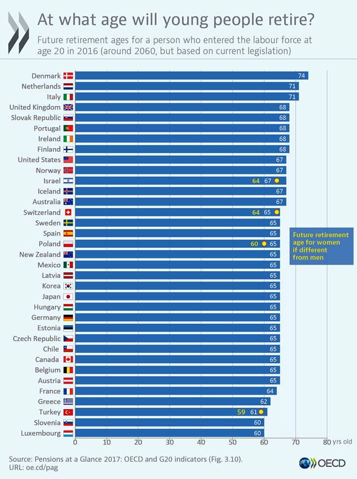 Egy évvel kevesebbet kéne dolgozniuk (tehát 67 évet) az amerikaiaknak, a norvégoknak, az izlandiaknak, az ausztráloknak és az izraelieknek. A legnagyobb változás Dániára vár: a jelenlegi korhatár 9 évvel emelkedne, így az első nyugdíjukat 74 évesen vehetnék át. A hollandok és az olaszok 71 évesen.