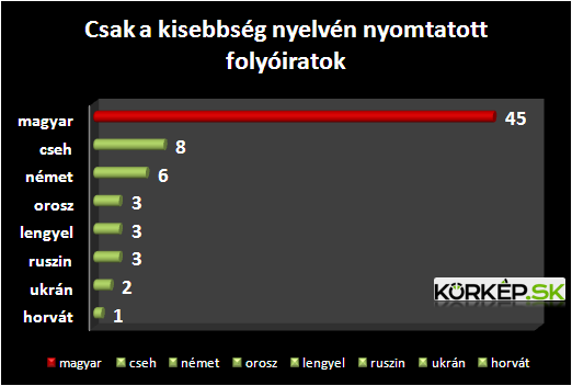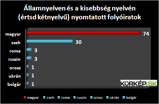 Szlovákiában 74 szlovák és magyar nyelvű folyóiratot adtak ki a jelentés adatai szerint, szemben a 45 tisztán magyar nyelvűvel. A kisebbségi és államnyelven is kiadott folyóiratok száma aránylag a cseheknél a legnagyobb, 8 tiszta cseh nyelvű folyóirat áll szemben 30 cseh és szlovák nyelven írt időszaki kiadvánnyal.