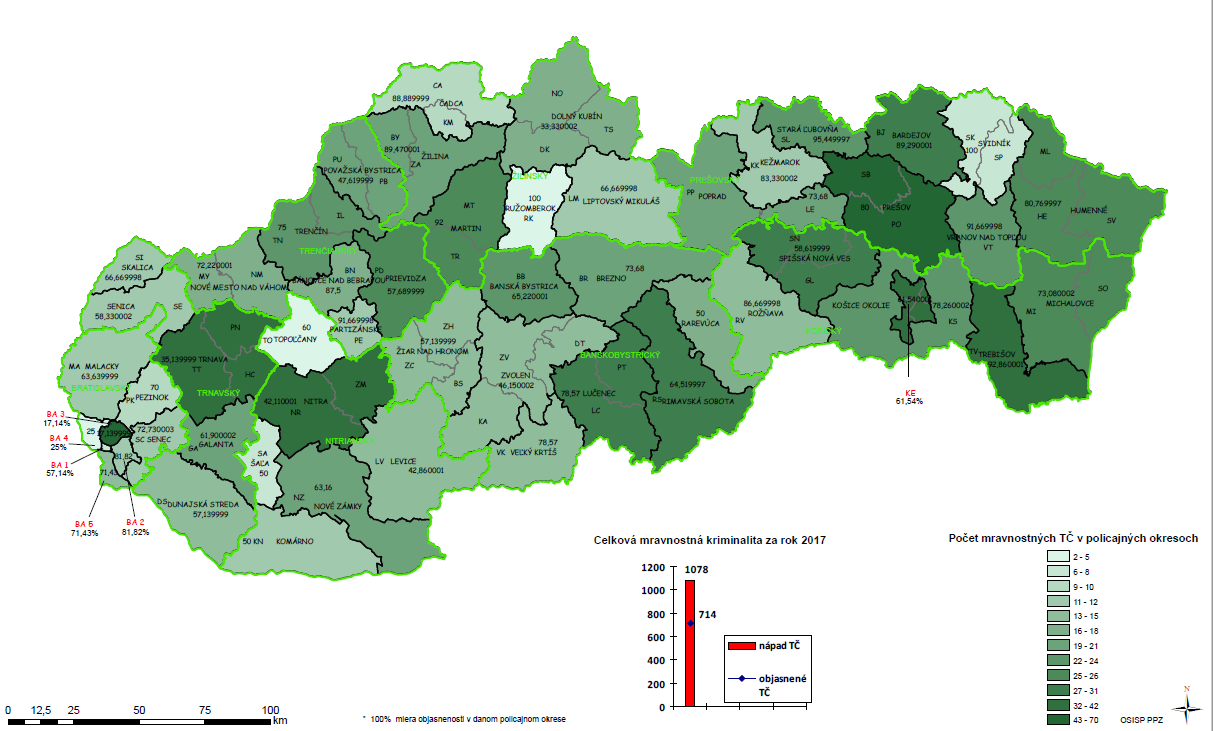 A legtöbb bűncselekményt a Nagyszombati, Nyitrai, Trencséni, Zsolnai Eperjesi járásokban illetve Pozsony második kerületében, valamint Kassán tartják nyilván. Ezek közül Pozsony II. kerületében a legalacsonyabb (44 százalékos) a felgöngyölített ügyek aránya.