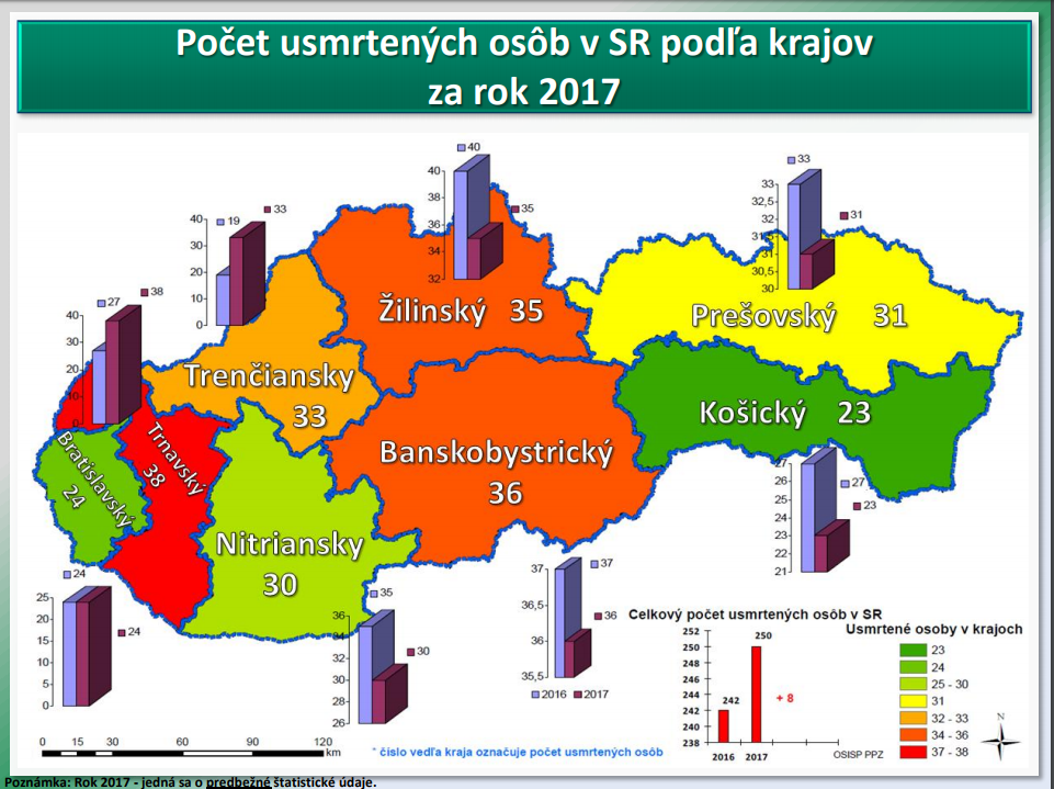 Északon Zsolna (Žilina) és Nagybiccse (Bytča), keleten Eperjes (Prešov) és Kisszeben (Sabinov) volt a legtöbb halálos balesetet elkönyvelő járás.
