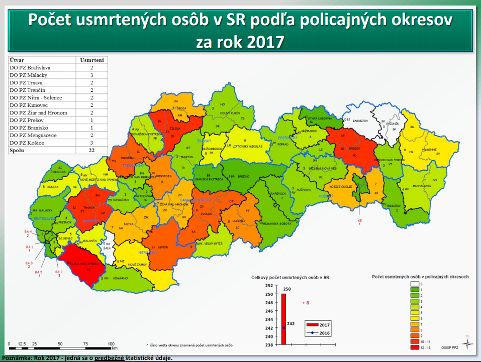 Ezzel szemben 8 olyan járás van Szlovákiában, ahol a nagyszámú, halálos áldozatokkal járó balesetről számolnak be a tavalyi év baleseti mutatói.