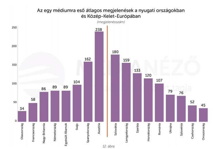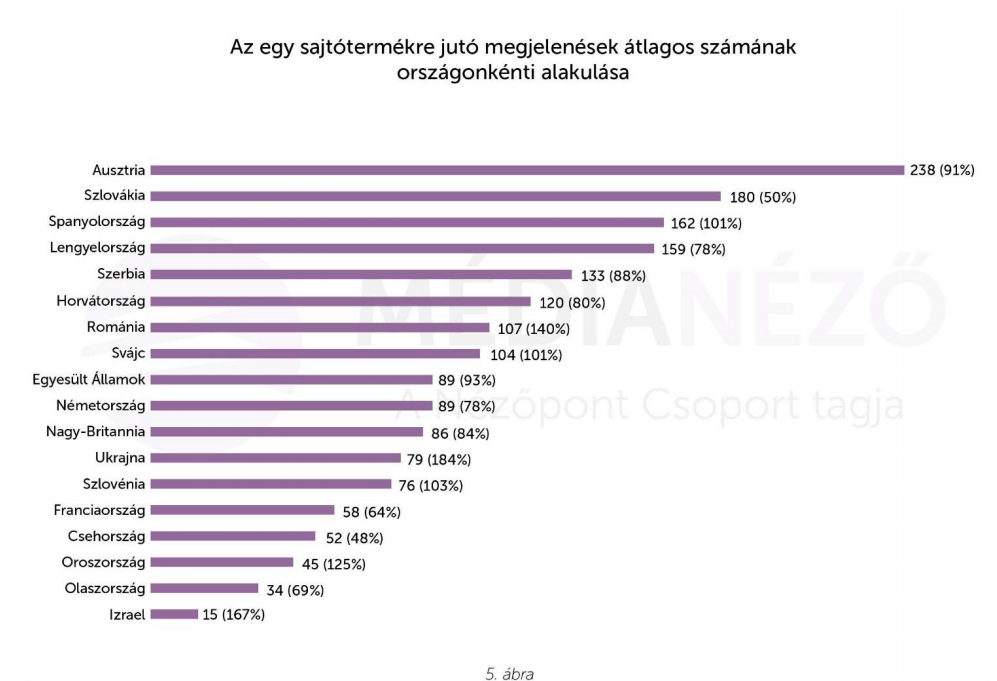 Átlagosan az osztrák, a szlovákiai és a spanyol médiumok publikálták a legtöbb magyar vonatkozású írást, a legkevesebb figyelmet Oroszország, Olaszország és Izrael sajtótermékei fordították a magyarországi eseményekre.