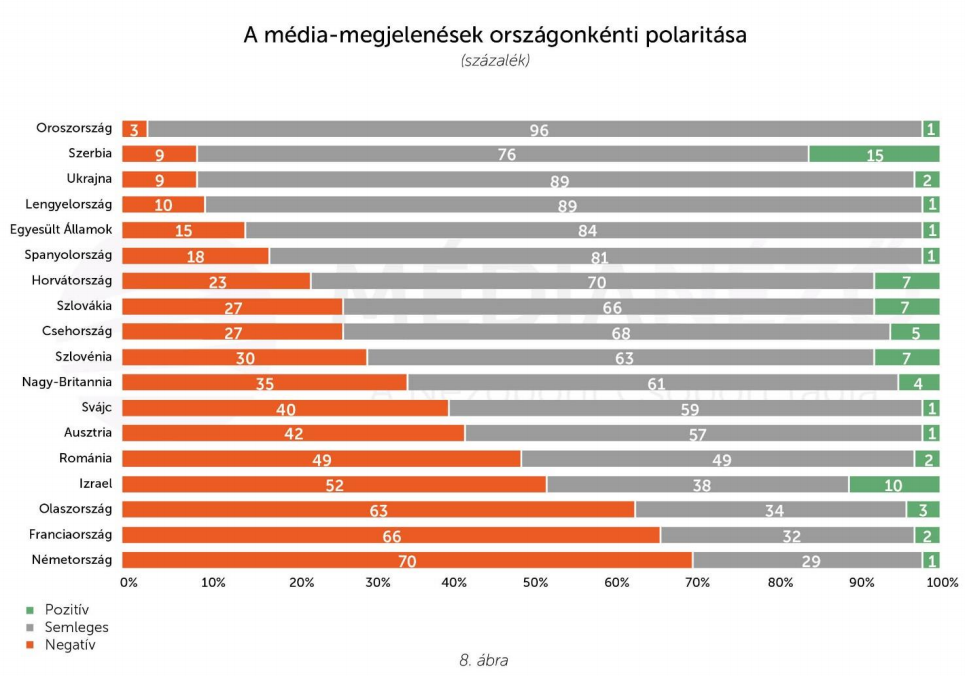 Annak ellenére, hogy az objektív és pozitív cikkek aránya elsöprő nagyságú, ki kell emelni, hogy a negatív hírek tekintetében egyértelműen Németország, Franciaország és Olaszország jeleskedett. Németországban a magyarországi tudósítások 70 százaléka volt negatív hangvételű, mindössze 29 százalék semleges, és 1 százalék pozitív. A franciáknál ez az arány 65:32:2, az olaszoknál 63:34:3.