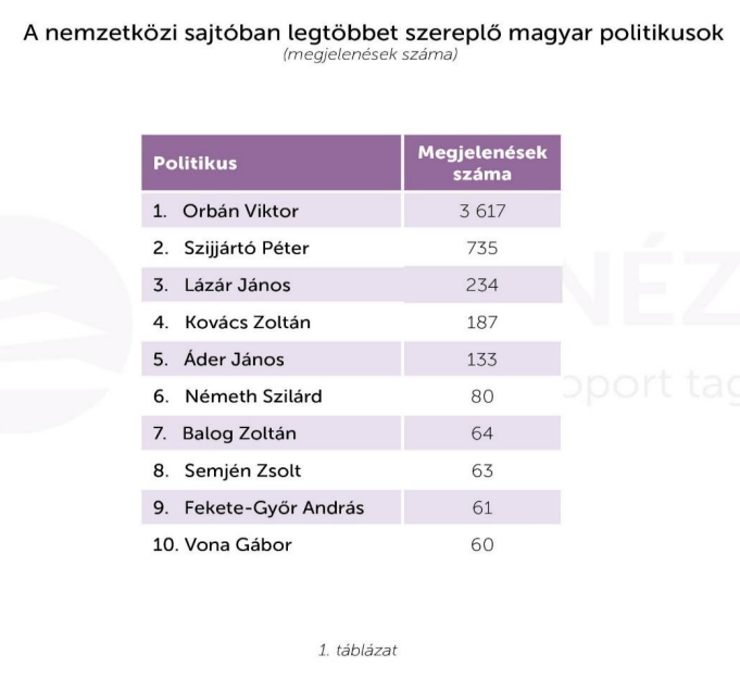 Orbán Viktor magyar miniszterelnökkel foglalkozott legtöbbet a külföldi sajtó, kétszer annyi cikk szólt róla, mint az utána következő kilenc politikus együttvéve. A 10 legtöbbször szereplő magyar politikus rangsorában az első nyolc hely a kormánypártoké, az utolsó két hely Fekete-Győr Andrásé (Momentum) és Vona Gáboré (Jobbik).