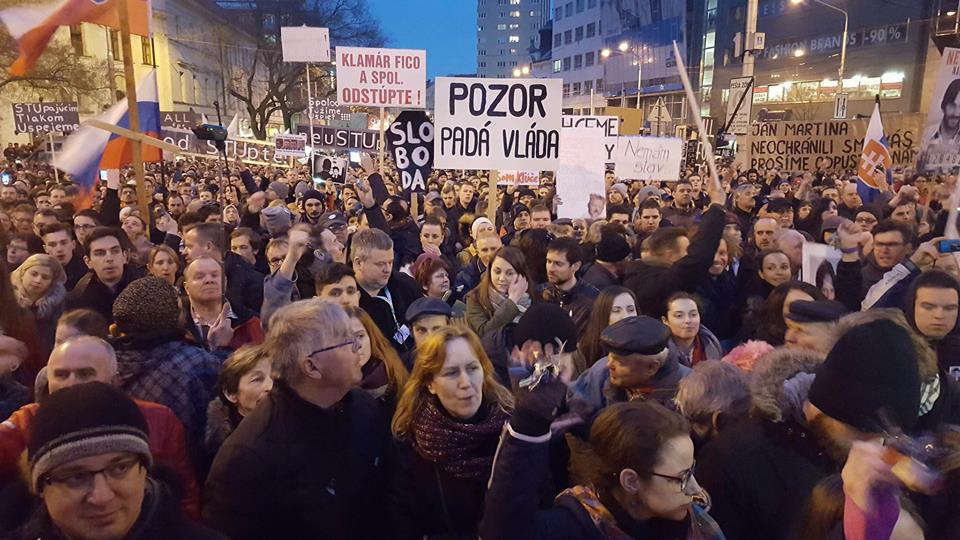 17:17 – A tüntetés békésen zajlik. A megnyitón elhangzott az „Elég volt Ficóból” rigmus, azóta a tömeg nyugodtan hallgatja a színpadon felszólalókat. A téma minden esetben a kormány kudarcairól szól. Štefan Hríb, a .týždeň főszerkesztője azt mondta, hogy Kuciak meggyilkolása óta eltelt idő alatt túl sok nyilatkozat történt, de túl kevés valódi tett. Élő videó: