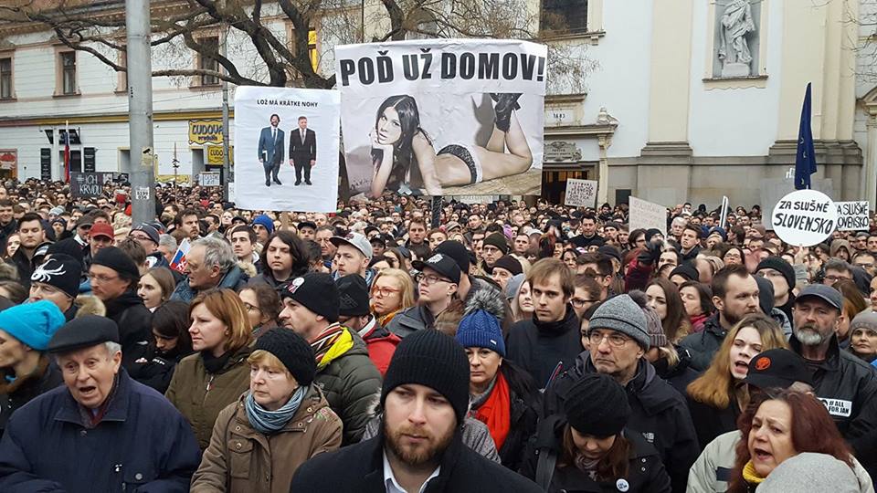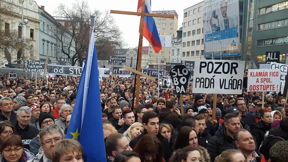 17:46 – Pozsonyban újra felzeng az „Elég volt Ficoból” és „mondjon le”. Nem marad el a „Börtönbe” jelsző sem. A tömeget néma csendre intik. A pódiumra Mária Kuciaková lép, a meggyilkolt Ján féltestvére.