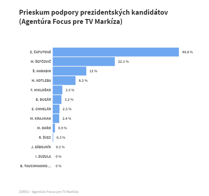 A legfrissebb felmérés szerint az elnökválasztás első fordulóját a szavazatok 44,8%-ával Zuzana Čaputová nyerné. A második helyezettre, Maroš Šefčovičra a válaszadóknak csupán a fele (22,1%) adná a szavazatát.