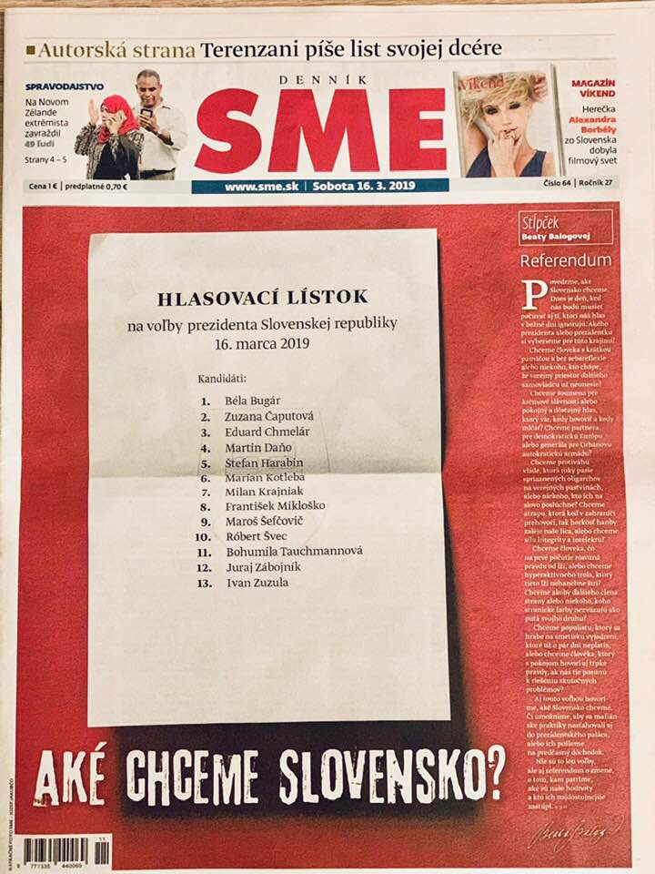 Maroš Šefčovič államfőjelölt közösségi oldalán arra hívta fel a figyelmet, hogy a SME ma megjelent hibás címlapja befolyásolhatja a választókat, őt magát pedig hátrányosan érintheti. A napilap fiktív választási ívén ugyanis hibásan szerepel a jelöltek sorszáma. A SME hibájára a másik érintett jelölt, Tauchmannová is felhívta a figyelmet.