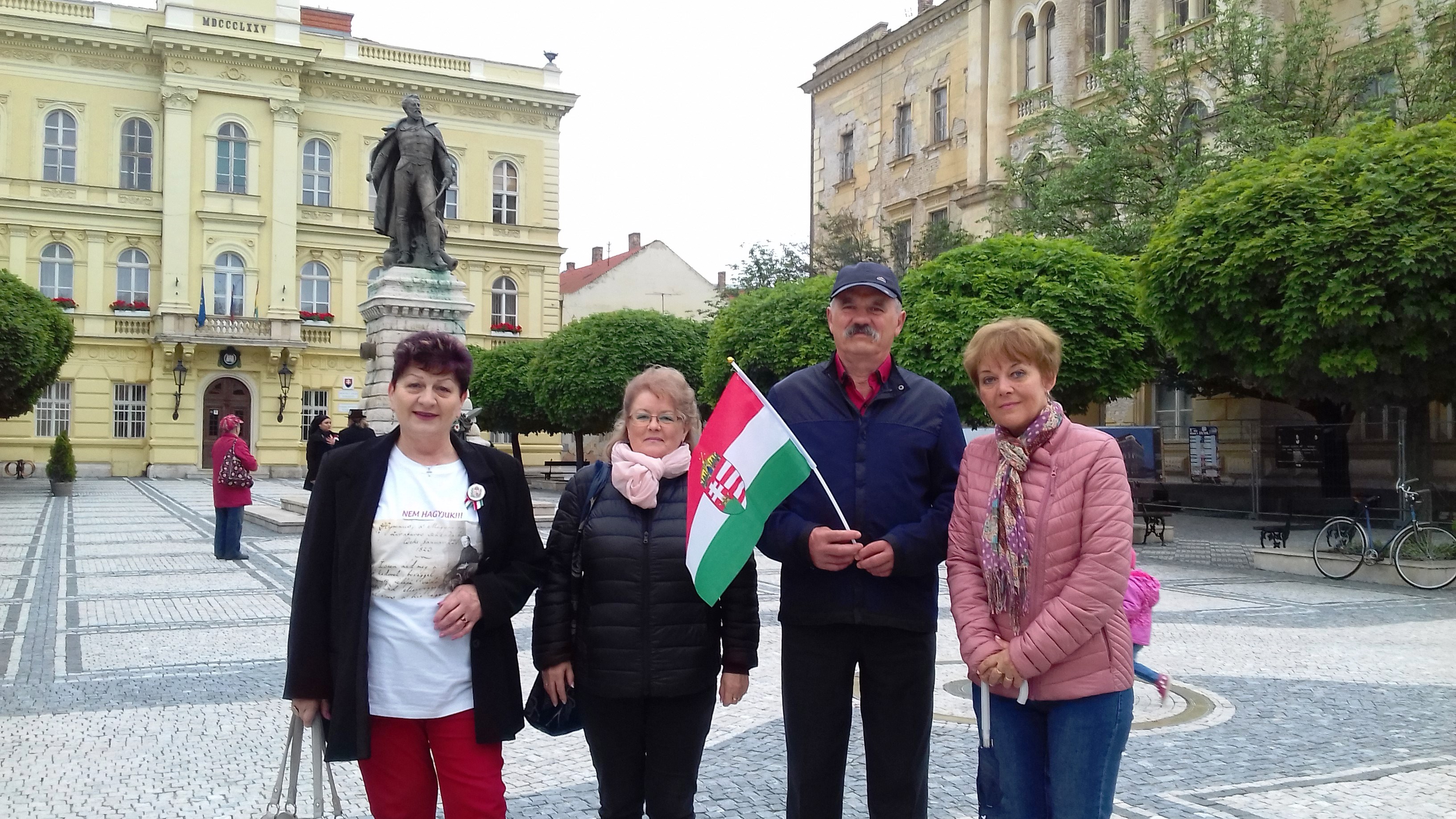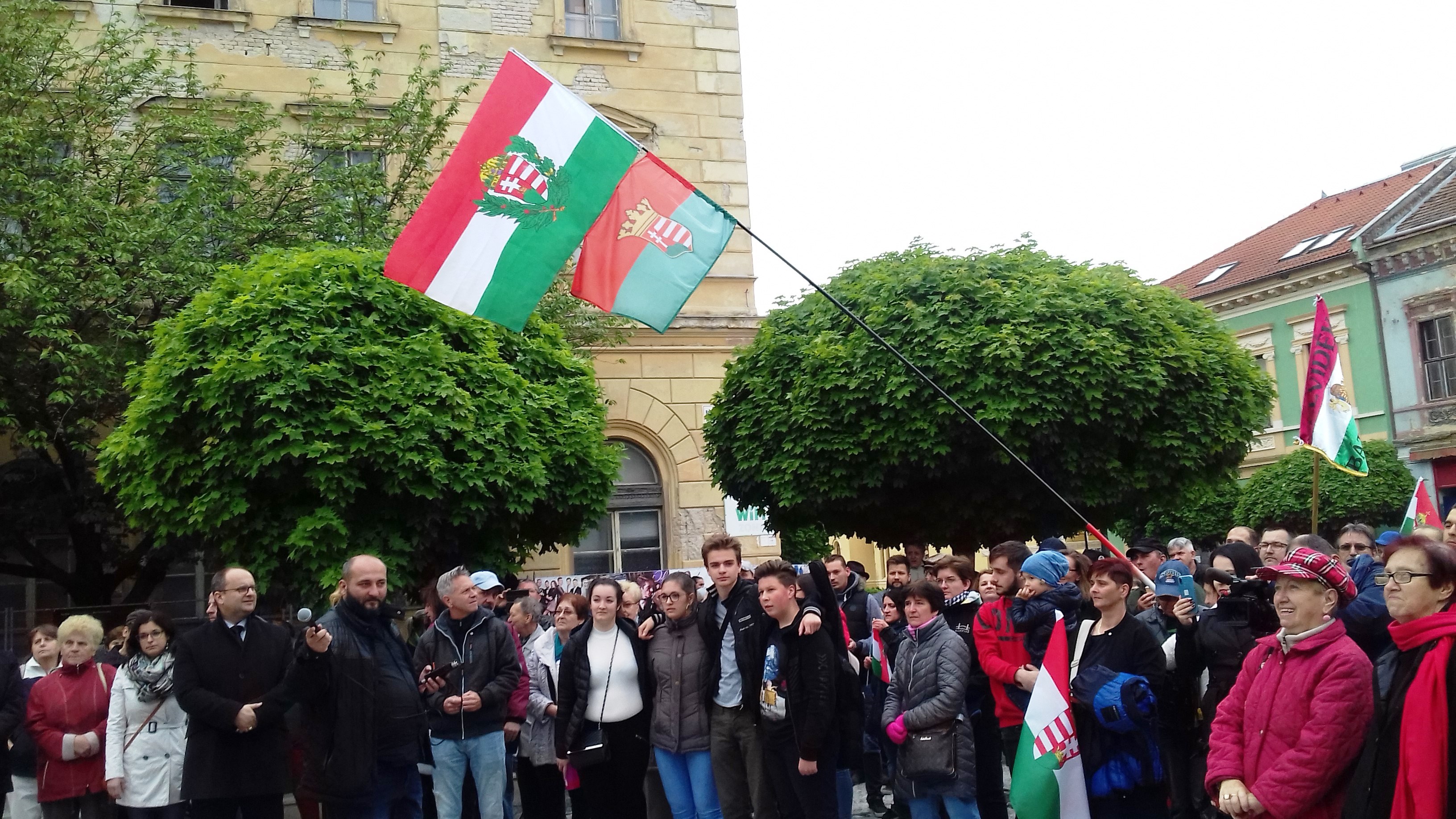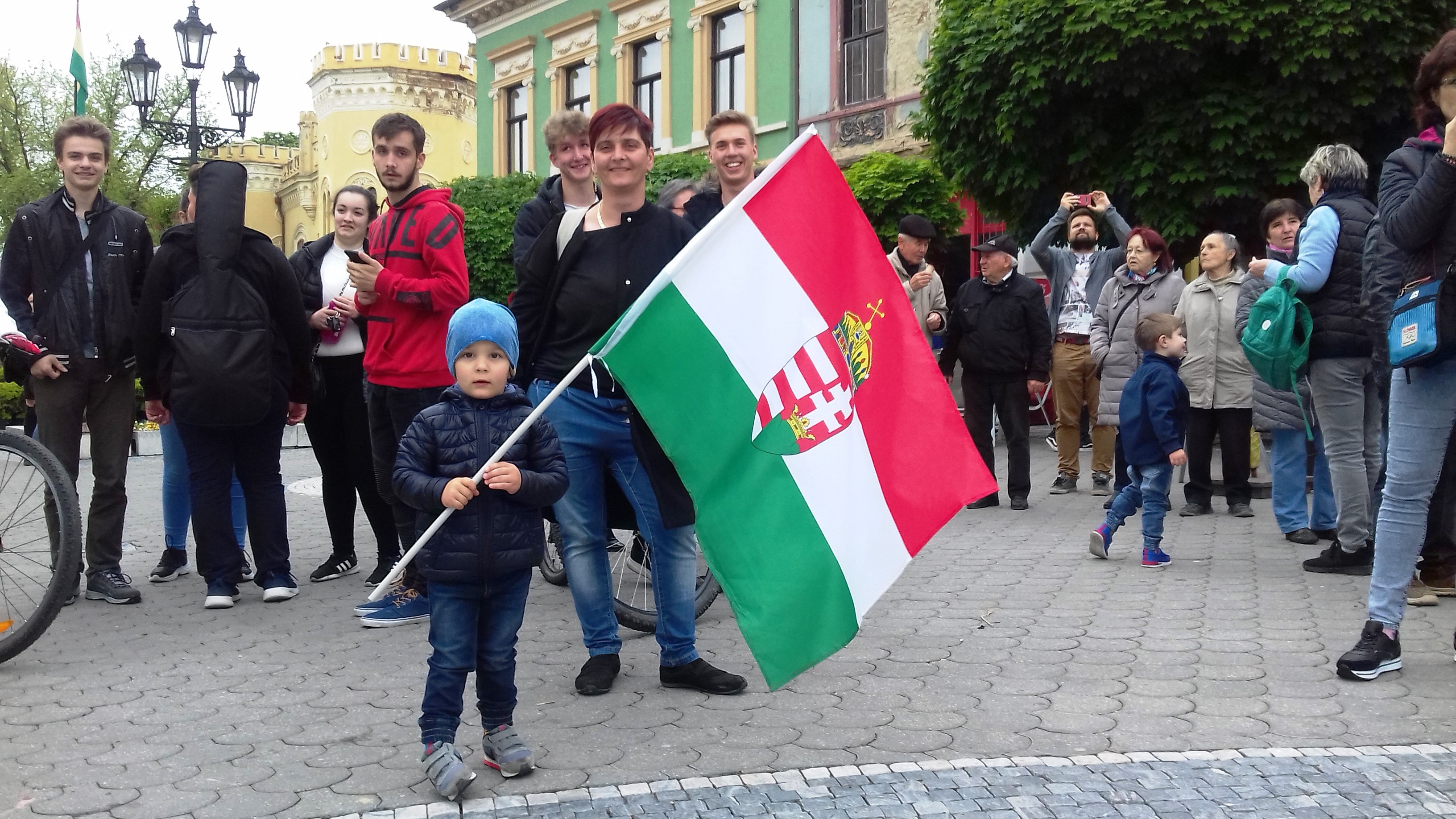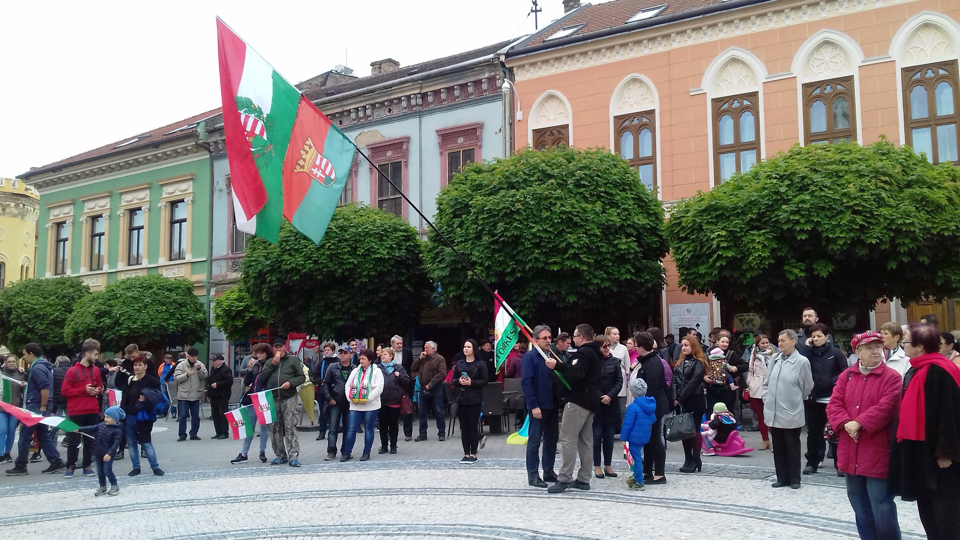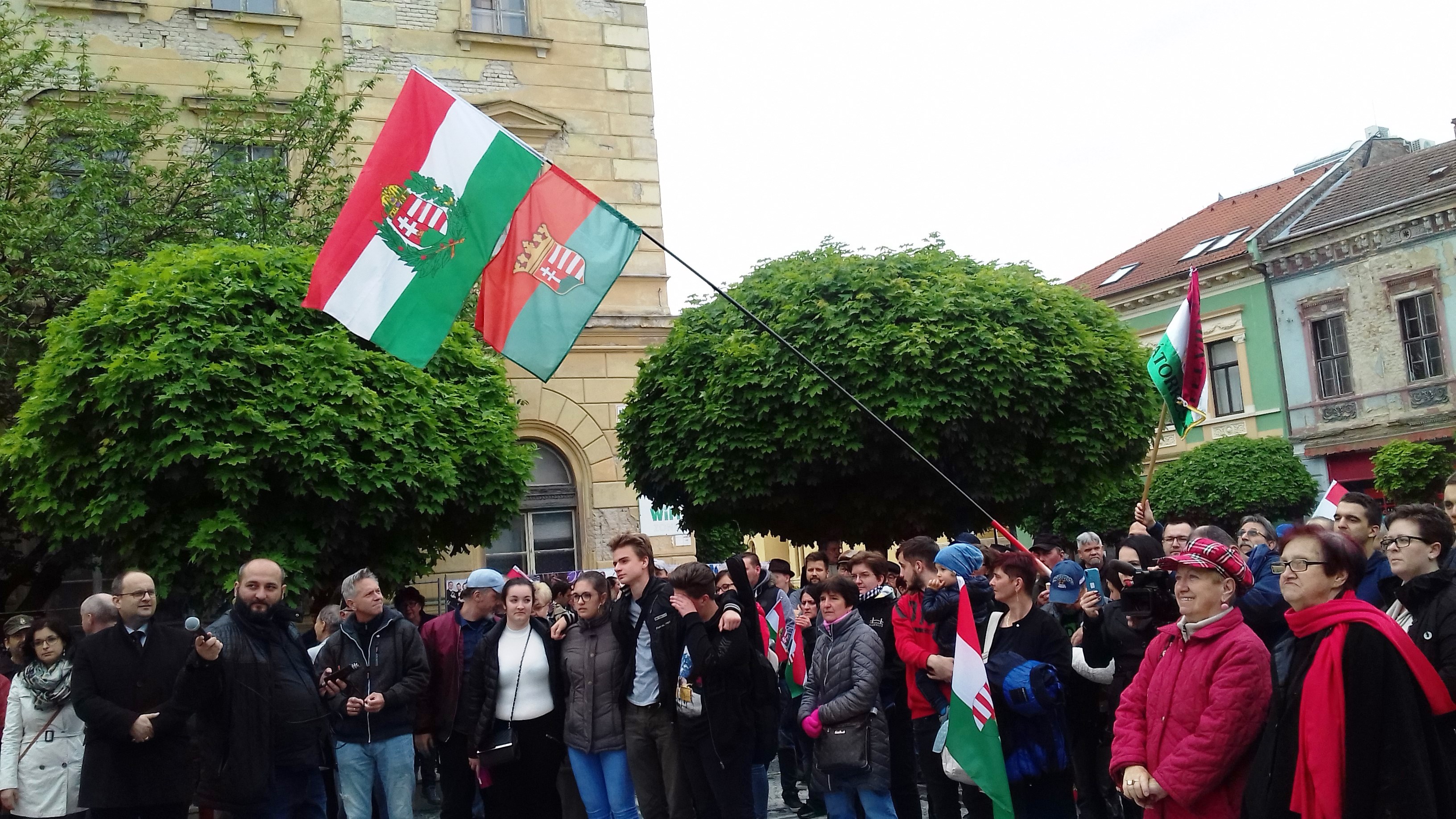 A rendezvényt Bujna Zoltán nyitotta meg lényegre törő rövid szónoklatával. A tömeghez intézett kérdései nagyon hatásosnak bizonyultak, szavaiból egyértelműen kicsengett, ma még senki sem lehet biztos, hogy a nemzeti imádságunkat tiltó törvény miként is dől el. Kérdésére, hogy ha himnuszunk az adott pillanatban tiltva volna, ki vállalná fel éneklését, a jelenlévő tömeg egy emberként emelte fel a kezét. Bujna Zoltán szónoklatában Jókai Mór és Klapka György nevével fémjelezte, hogy mi, a magyar nemzet részeként vagyunk ennek a városnak őshonos lakói, és senki nem veheti el tőlünk azt a jogot, hogy nemzeti himnuszunkat énekeljük, nemzeti jelképeinket használjuk.