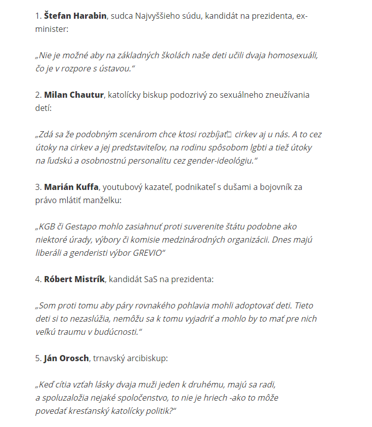 Az idei jelöltek között szerepel Štefan Harabin és Róbert Mistrík, de három egyházi személy is felkerült a listára. Ján Orosch nagyszombati érsek és Milan Chautur kassai eparcha mellett Marián Kuffa kontroverz atyát idén immáron harmadszor jelölték az Év Homofóbja Anti-díjra.