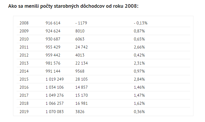 Szlovákiában az elmúlt években megnövekedett a nyugdíjasok száma, az öregségi nyugdíjasoké pedig 2008-ig 150 ezerrel emelkedett. Némelyik évben az időskori nyugdíjasok tábora néhány ezerrel bővült, de voltak olyan évek is, amikor mintegy 30 ezerrel.