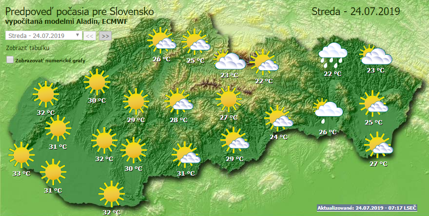 Az ország nyugati felében verőfényes napsütésre számíthatunk, Közép-és Kelet-Szlovákiában közepesen felhős, változékony időjárás várható. Csapadék csak a keleti járásokban fordulhat elő, kivételes esetben zivatarok is kialakulhatnak.