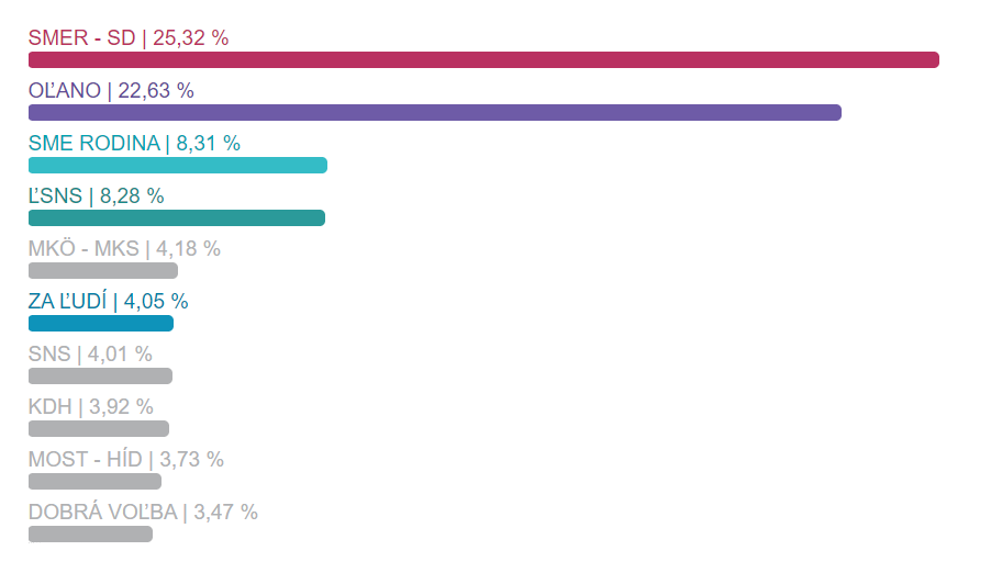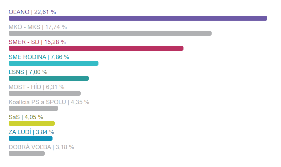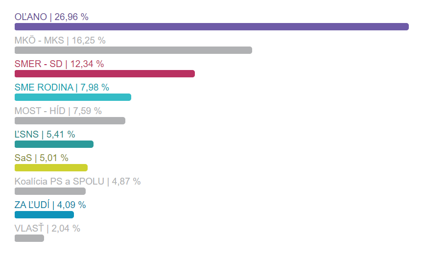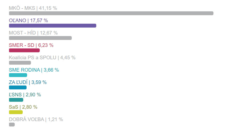 A február 29-ei parlamenti választás az Igor Matovič vezette OĽaNO győzelmét hozta. A magyar politikai pártok közül sem az MKÖ-nek, sem a Most-Hídnak nem sikerült a bejutás. Az alábbi grafikonok azt szemléltetik, hogy mely politikai szubjektumokra adták a legtöbb szavazatot a magyarlakta járásokban nyugattól keletig.