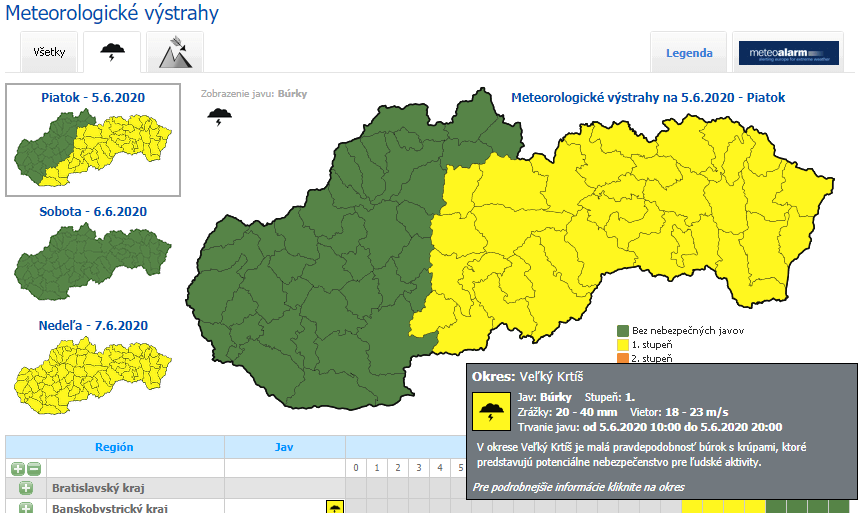 A délutáni órákban egészen estig, egyes esetekben késő estig heves zivatarok miatt rendelt el elsőfokú riasztást a Szlovák Hidrometeorológiai Szolgálat.