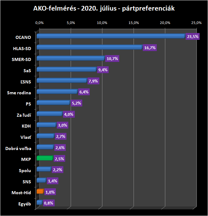 A legkisebb kormánypárt, a Za ľudí azonban 4 százalékkal nem érné el a parlamenti küszöböt, és a KDH is veszélyesen eltávolodott a küszöbtől (3 százalék). Az MKP 2,5 százalékos, a Most-Híd 1 százalékot kapott az AKO-tól – áprilisban az ügynökség 4,4 százalékra mérte az MKP-t, 0,6 százalékra a Most-Hidat.