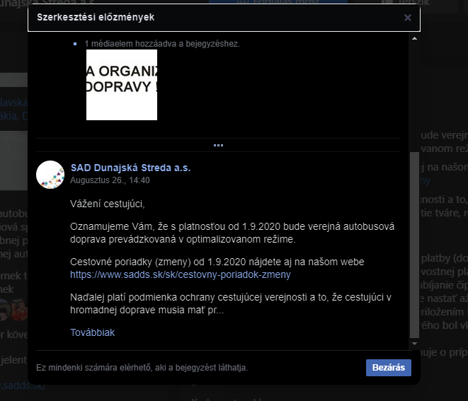 A Szlovák Autóbuszközlekedési Vállalat – dunaszerdahelyi, Rt. hivatalos Facebook-oldalán található egy bejegyzés március 16. keltezéssel, amelyben a vállalat egyéb információk mellett arról értesíti az utasokat, „hogy 2020. szeptember 1-től a közlekedés optimalizált módban közlekedik” (mármint az autóbuszok optimalizált módban közlekednek… – a szerk.). A dátum senkit ne tévesszen meg, a bejegyzés szerkesztési előzményeiben látható, hogy csak módosítottak egy márciusi posztot, mégpedig augusztus 26-án, délután 14:40-kor, egy héttel a tanévkezdés előtt. Ugyanezen a napon értesítették ki e-mailben a településeket is.