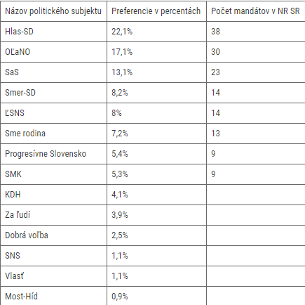 A parlamentbe további öt politikai szubjektum jutna be: Smer (8,2%), Kotleba-féle ĽSNS (8%), Sme rodina (7,2%), Progresívne Slovensko (5,4%), MKP (5,3%).