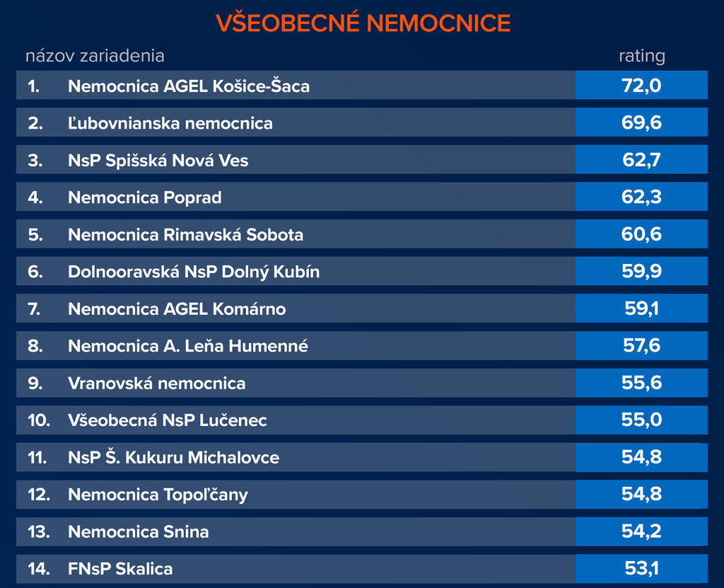 Az általános kórházak kategóriájában a kassa-sacai AGEL kórház végzett az első helyen. A második helyet az ólublói, a harmadikat pedig a Svet zdravia hálózathoz tartozó iglói kórháznak sikerült megszereznie.