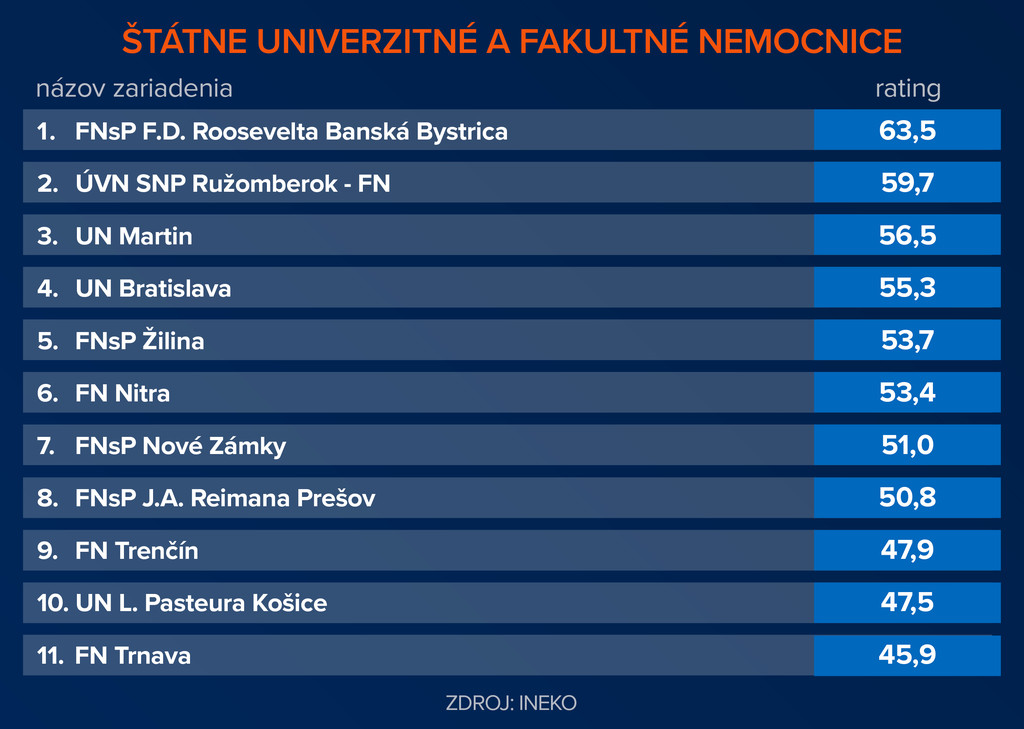 A két legjobb kórház a tavalyi évhez hasonlóan most is a besztercebányai F. D. Roosevelt Egyetemi Kórház és Rendelőintézet, valamint a kassa-sacai 1. magánkórház lett – tájékoztatott a Gazdasági és Szociális Reformok Intézete (INEKO) az immáron hatodik alkalommal elkészített rangsorról.