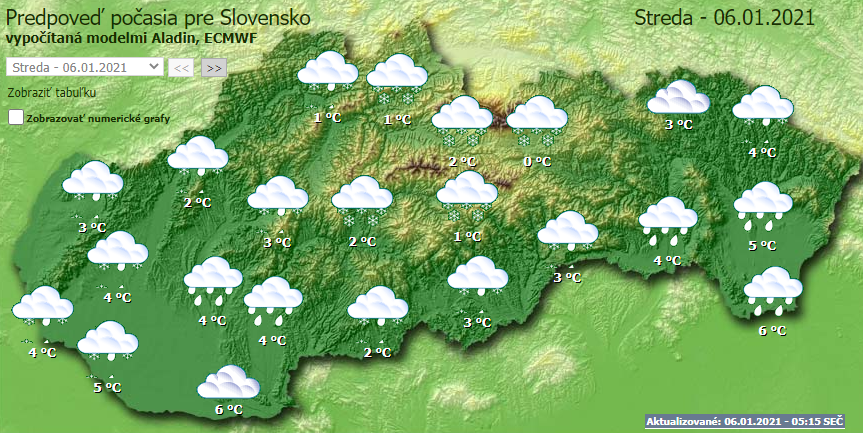 Szerdán országszerte csapadékos, borult idő várható. Napközben fokozatosan minden régióban elered az eső, északon a hó, Közép-Szlovákia déli részén a havaseső. 400 méter felett már havazásra kell számítani.