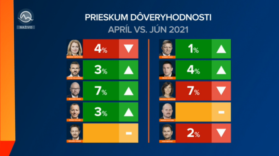 Az ellenzéki politikusok közül az utóbbi hónapokban leginkább Robert Fico megbízhatósága növekszik, akik a választások után mindössze 19–20%-on mozgott, 2021 júniusára pedig 25%-ra nőtt a megbízhatósága.