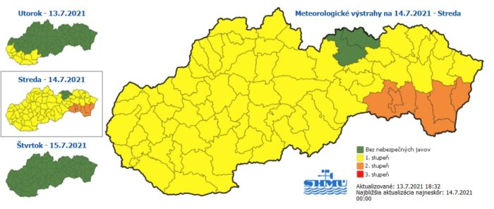 Szerdán viharokra kell számítani Szlovákia nagy részén, ezért a Szlovák Hidrometeorológiai Intézet elsőfokú figyelmeztetéseket adott ki. A nagy hőség – akár 37 fokot is mutathatnak a hőmérők – miatt ezen felül Kassa megyében másodfokú, Eperjes és Besztercebánya megyében elsőfokú hőségriasztás lesz érvényben.