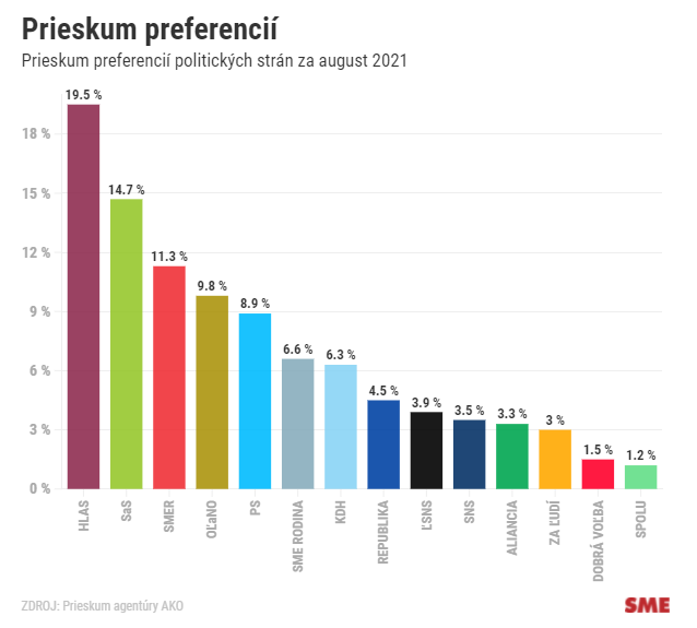 Amennyiben augusztusban tartanák a parlamenti választásokat, azt Peter Pellegrini Hlas pártja nyerné a szavazatok 19,5%-val. Annak ellenére, hogy továbbra is Pellegrini pártja vezet, a júliusi AKO-felmérés eredményéhez képest (20,8%) némileg csökkent a párt népszerűsége.