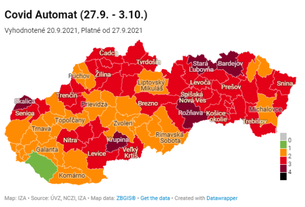 Nyitókép: korona.gov.sk/SME Szeptember 27-től, hétfőtől öt járás lesz bordó besorolású. 39 járás piros színű lesz, míg 34 járás narancssárga....