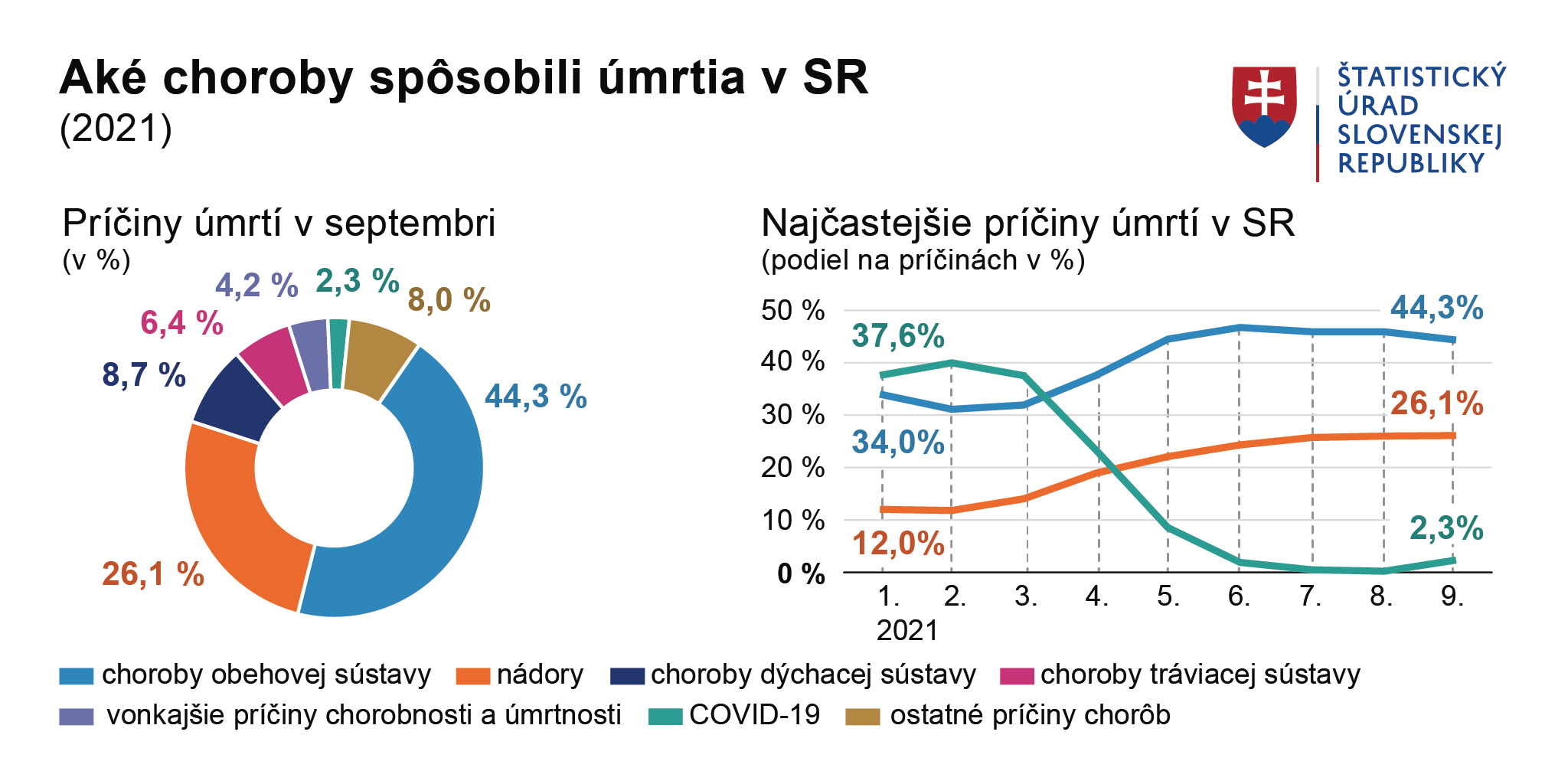 A koronavírus a tavaszi dobogós helyről nyár végére a 12. helyre csúszott vissza a halálozás leggyakoribb okainak rangsorában. Szeptemberre azonban az új járványhullám néhány hét alatt a hatodik helyre hozta fel, miközben az elmúlt öt év szeptemberi halálozási átlagánál idén szeptemberben 6 százalékkal többen hunytak el Szlovákiában.