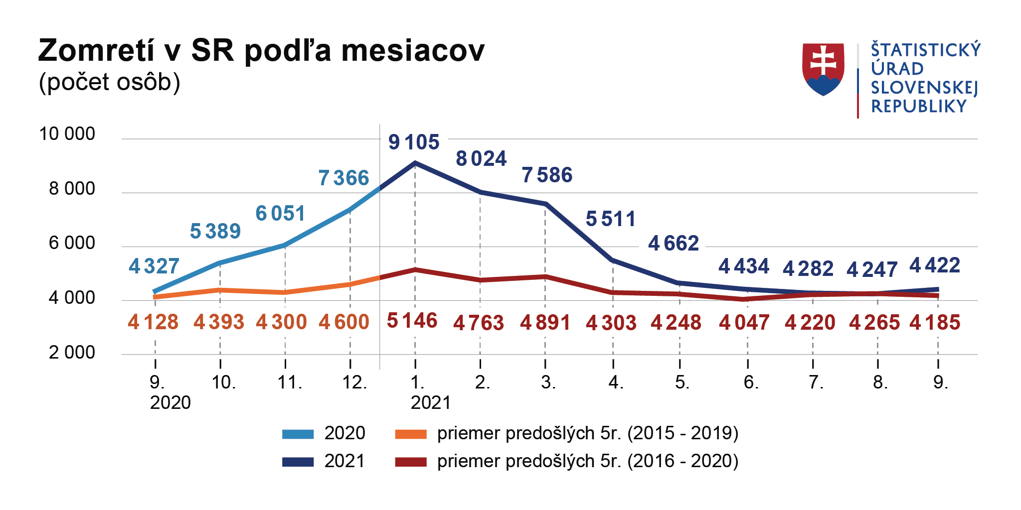 Nyolc hónap után ismét megmutatkozik a halálozási statisztikában az erősödő járványhullám. A halálos mértéke az ötéves átlagtól 6 százalékkal volt magasabb szeptemberben, elsősorban a 64-75 év közöttiek halandósági mutatói romlottak – derül ki a Szlovák Statisztikai Hivatal aktuális adataiból. A túlhalálozás mértéke leginkább Nagyszombat és Kassa megyében emelkedett.