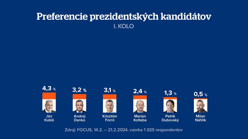 Ezek szerint az elnökválasztás első fordulóját ha szorosan is, de Peter Pellegrini nyerné, mögötte alig lemaradva Ivan Korčok következik. A két fő favorit között február végén a Focus szerint kevesebb, mint 2 százalék a különbség.