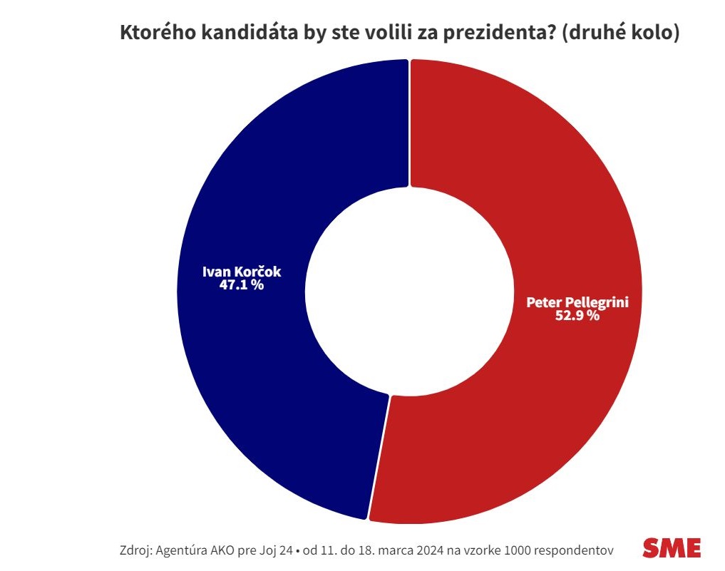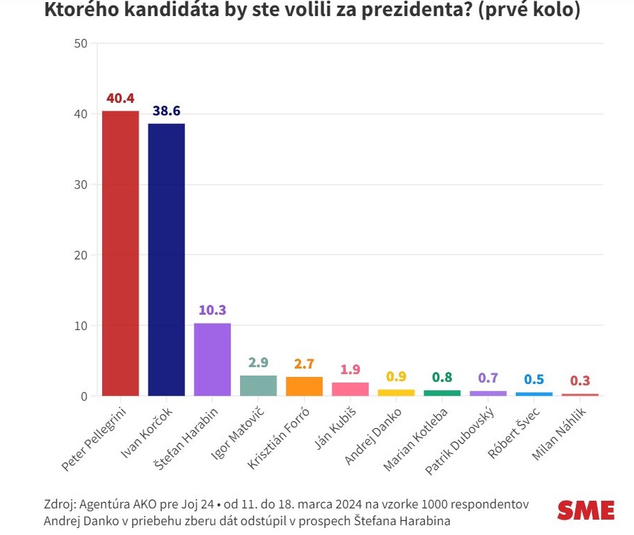 A liberális, progresszív jelölt, Ivan Korčok nem egész két százalékkal lemaradva, 38,6 százalékot szerezne. A harmadik helyen Štefan Harabin befutása várható 10,3 százalékkal, akit Igor Matovič követ 2,9 százalékkal. Az ötödik helyen szorosan a korábbi kormányfő mögött a Magyar Szövetség elnöke, Forró Krisztián áll az AKO ügynökség felmérése szerint.