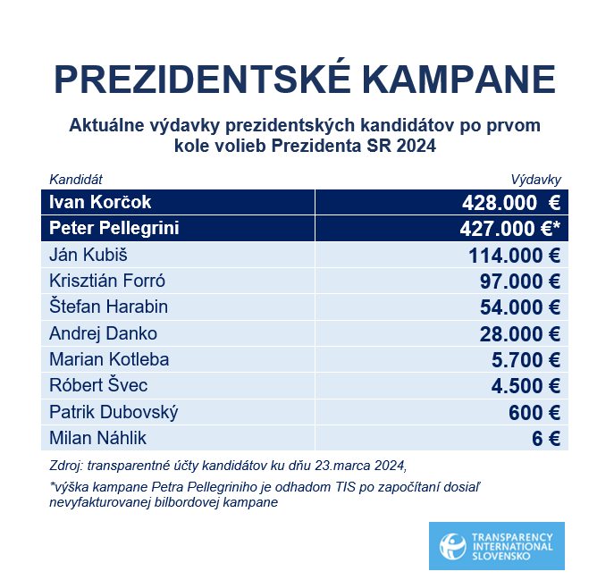 Közben a Transparency Szlovákia közzétette az államfőjelöltek kampányköltségeit az első fordulóban. Pellegrini és Korčok fej-fej mellett haladnak, negyedik helyen a 66 ezer szavazatára 97 ezer eurót költött Forró Krisztián áll.